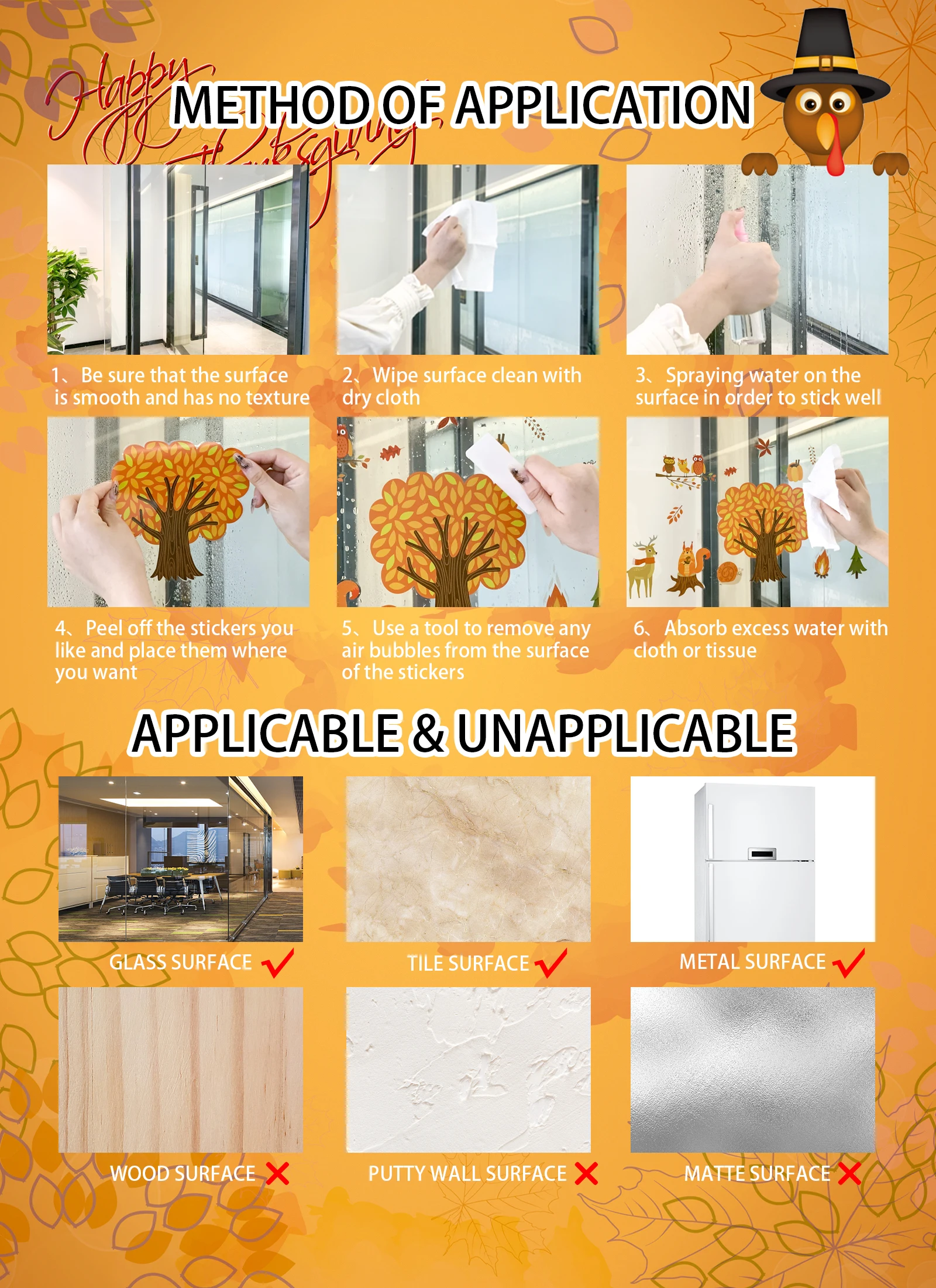 Leave no marks - No glue static Fall window clings, please clean the window surface before installation, use a wet towel to wipe the window surface or spray some water, directly paste the product
